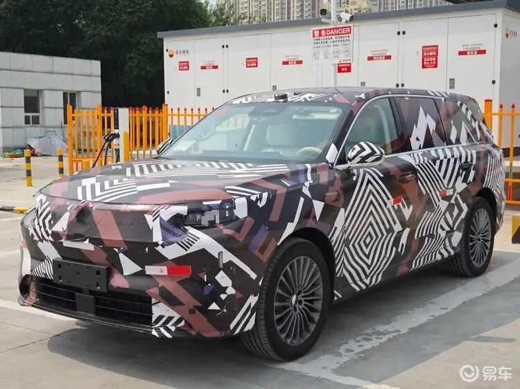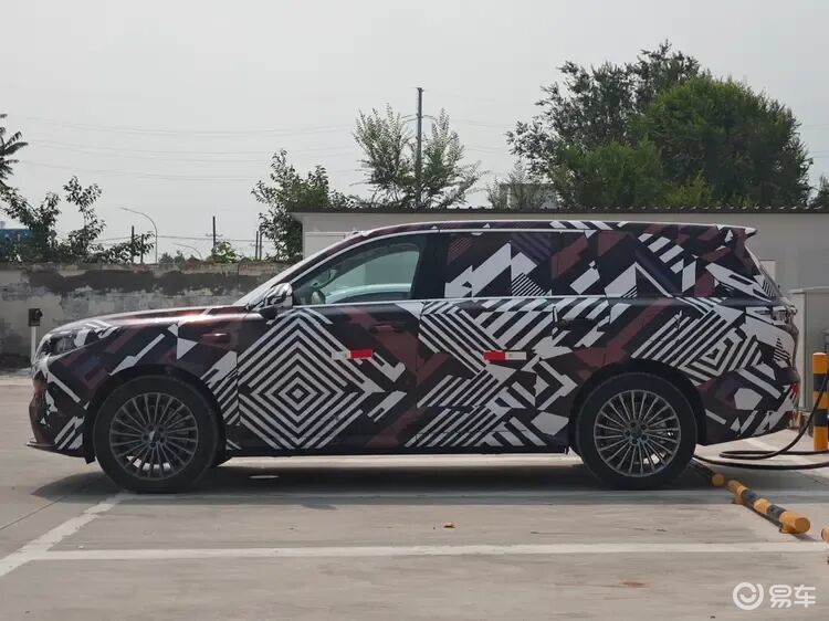 来到车身侧面,新车整体强调修长且圆润设计,车身尺寸方面,目前曝光的信息,只有新车的车长为5.3米,细节方面,配备传统造型车门外拉手,前翼子板处搭配智驾辅助硬件,配备多幅式轮圈,预计尺寸在21英寸,座椅布方面,新车预计采用2+2+2布局。