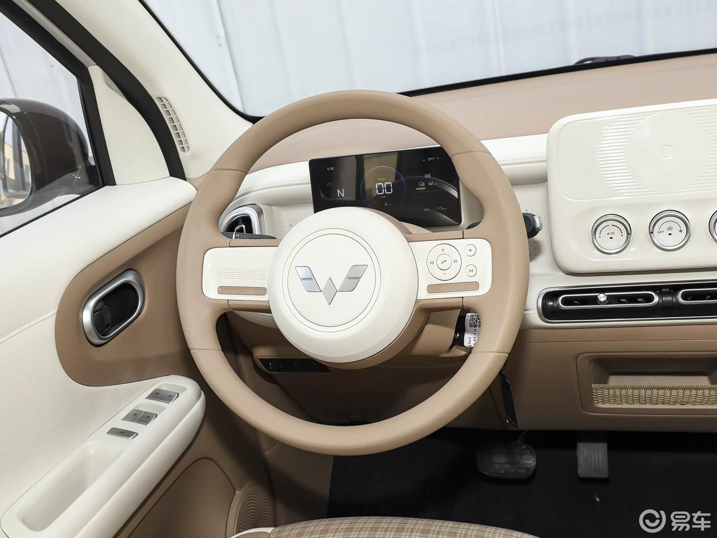 车内部分,第五代五菱宏光MINIEV的整体布局更为简洁大气,配色也比较温馨,中控区域提供有双幅式多功能方向盘、7英寸液晶仪表盘、10.1英寸悬浮式中控屏以及全新升级的电子怀挡,中央通道区域的空间变得更大,兼顾了颜值和实用性。