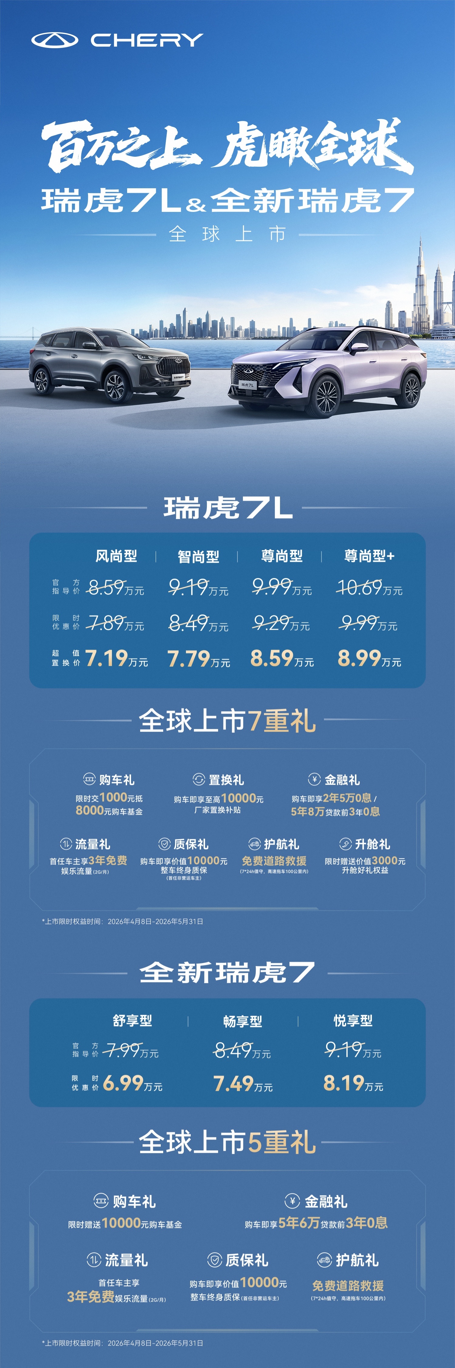 三款新车均依托瑞虎家族"双百万"全球实力背书——瑞虎7系与瑞虎5系累计销量均突破百万,远销全球100多个国家和地区,连续斩获中国A级及A0级SUV出口冠军。奇瑞以全球研发、制造与严苛验证体系,将纯粹"全球车"品质带入主流市场,真正实现"全球品质,国民定价"。