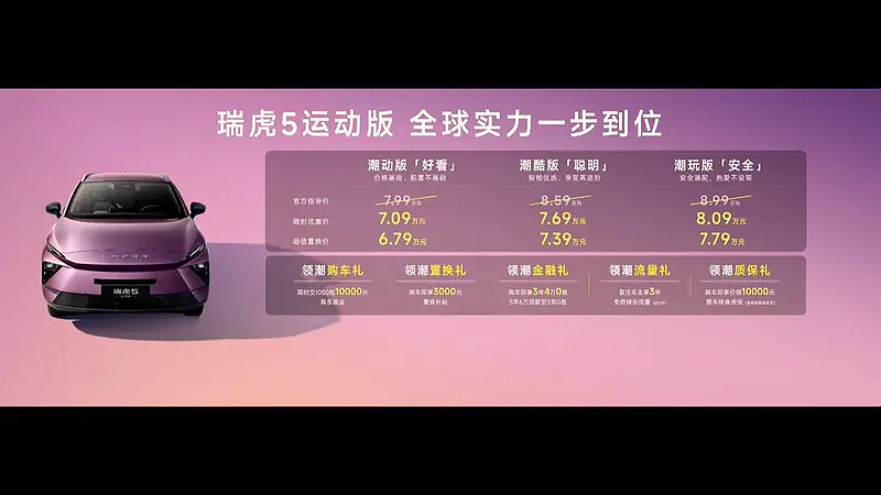 瑞虎5运动版则以"全球智酷精品SUV"姿态,成为年轻人拒绝将就的"第一台精品SUV"。同级独有高通骁龙8155芯片、AI大模型语音助手、80%高强度钢车身等硬核配置拉入7万级市场,以"好看、聪明、安全"的越级体验终结"将就时代"。