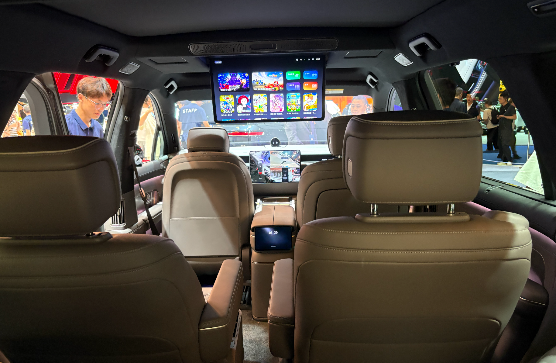 比如,云白色搭配帕米尔棕内饰的 6 座签名版,现场与七夕花艺结合,花香与车内的高级氛围相互呼应,瞬间让人联想到家庭与温馨的场景。另一台星澜灰色的车型,则以“前 LEMMO 后高尔夫”的方式布置,车前是智能健身器械,车后是高尔夫球具,直接把都市精英的生活方式搬到了车展现场。