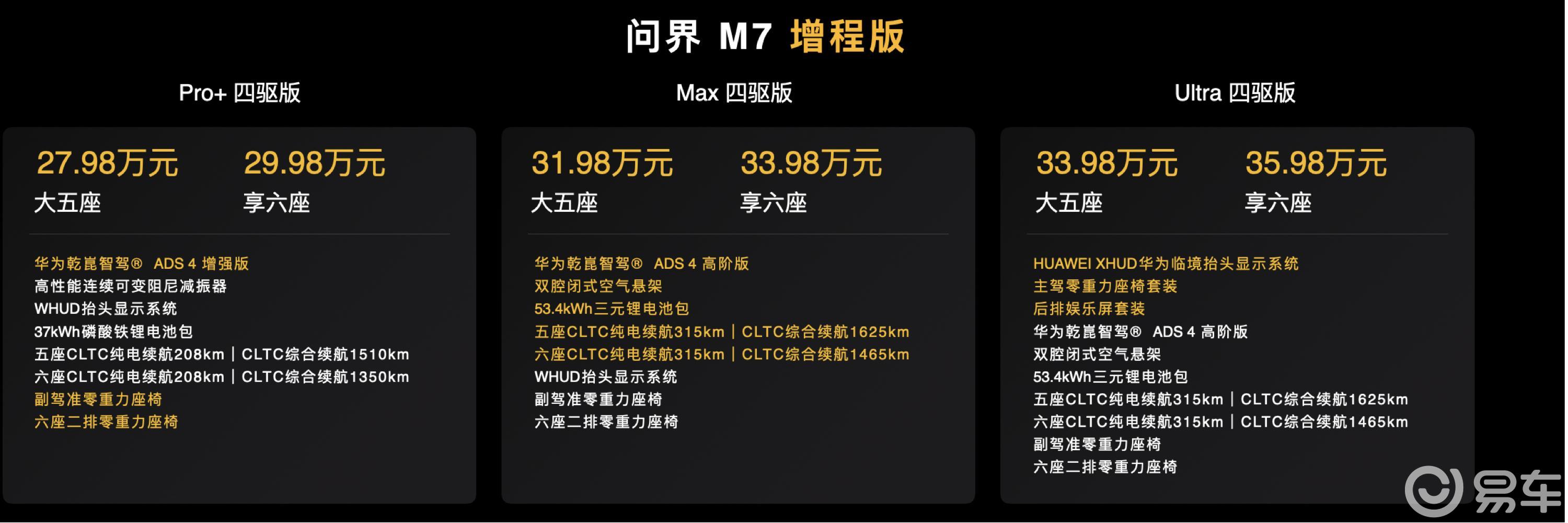 全新问界M7提供增程纯电双动力,大五座与享六座两种座椅布局。全新问界M7增程版27.98万元起售,纯电版31.98万元起售。顶配35.98万元。