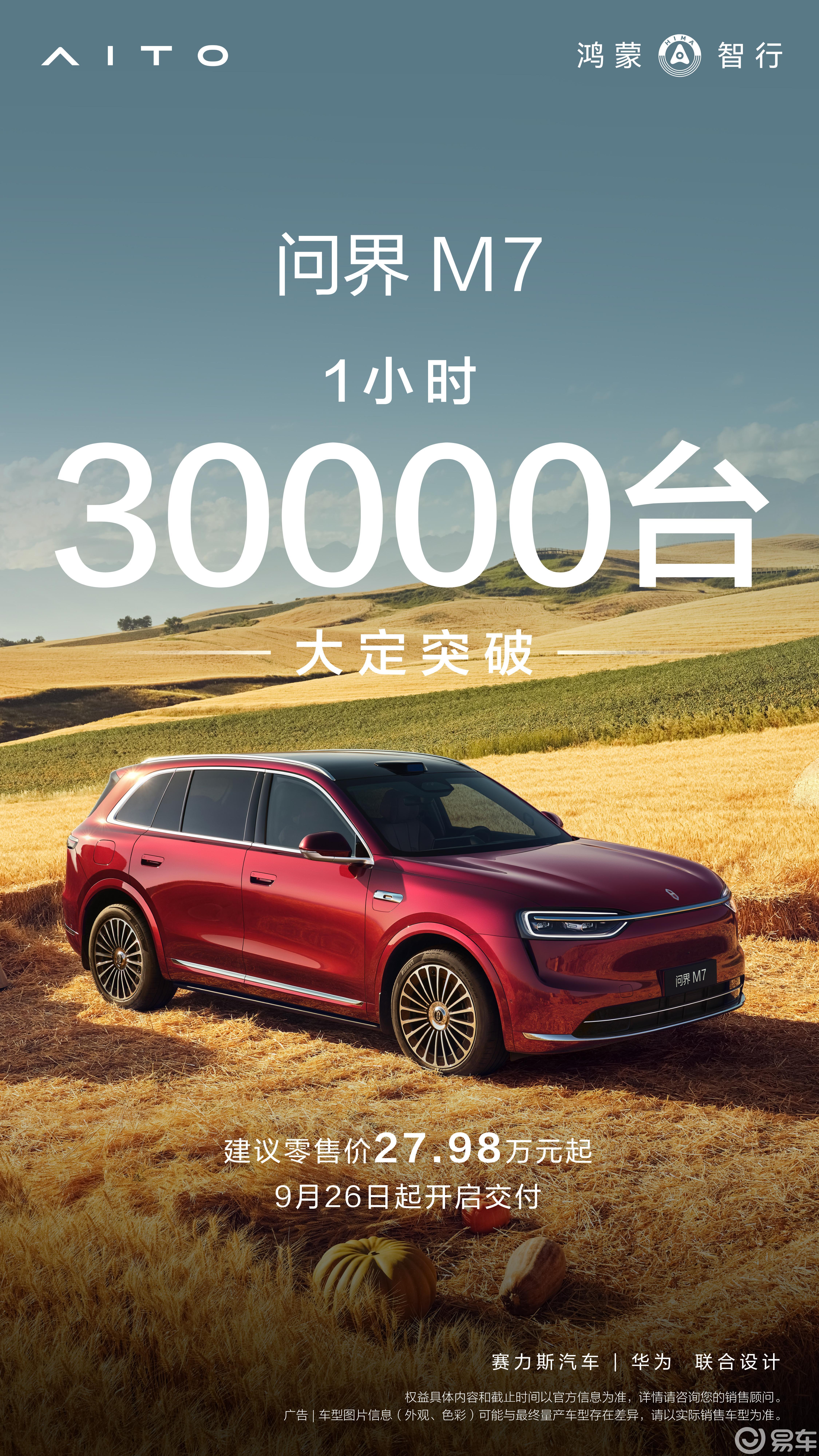 问界M7:一小时大定30000台,问界锁定爆款问界M7自2024年至今稳居中国新势力销量榜首,累计交付突破30万辆,直接刷新了中国新能源豪华品牌的纪录。全新问界M7 上市后一小时大定突破30000台!再创鸿蒙智行新纪录。