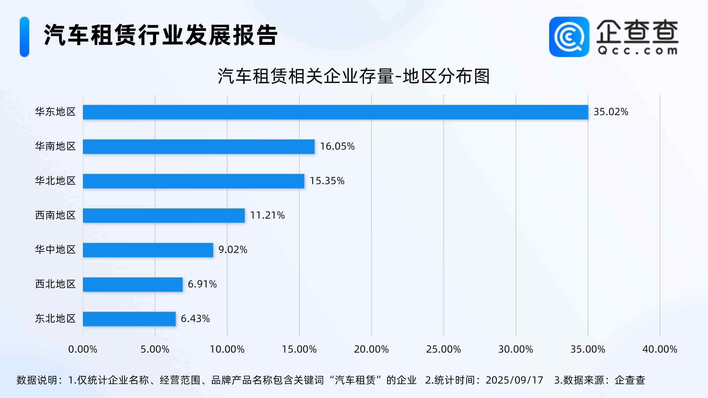 企查查数据显示,从地区分布来看,汽车租赁相关企业主要集中分布在华东地区,占比达35.02%。其次,分布在华南地区、华北地区的相关企业分别占比16.05%、15.35%。