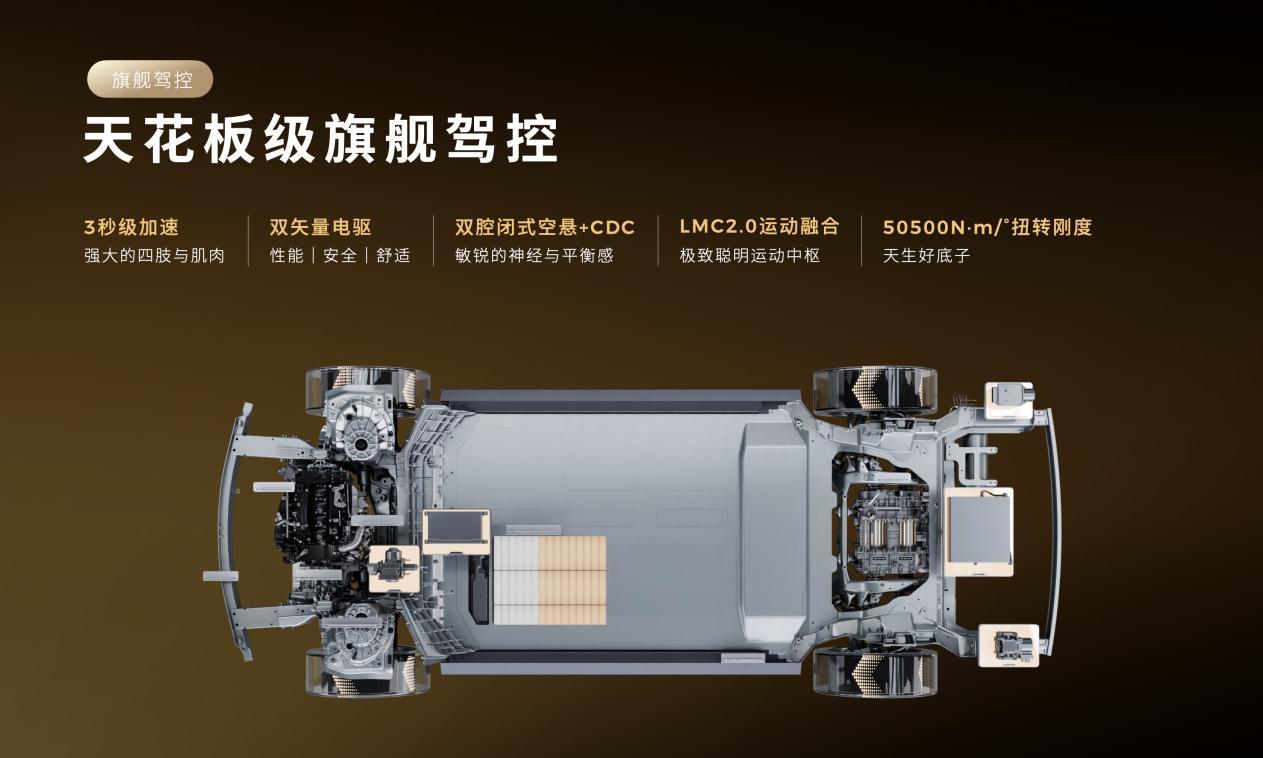 驾控方面也有诸多首创技术,LMC 2.0底盘系统支持双轮爆胎控制、凌波微步平顺体验、3.6米级圆规掉头半径等顶级技术。