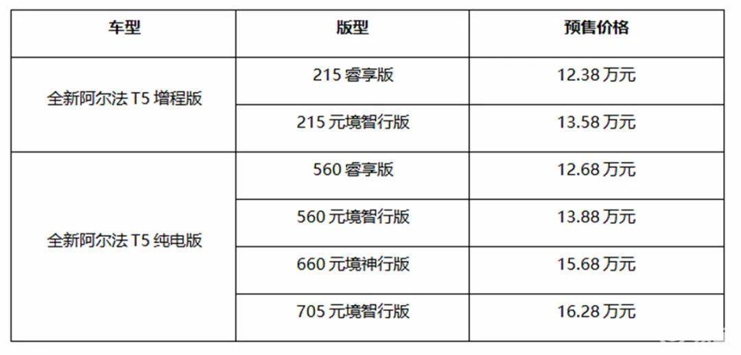 据悉,极狐全新阿尔法T5预售共推出6个版型,包含纯电和增程两种动力形式,预售价格12.38万元—16.28万元,以更年轻的设计风格、更强的动力续航、更智能的操控、更舒适的驾乘和天花板级的安全健康,为年轻家庭用户带来了中级SUV的新选择。即日起通过极狐APP或小程序支付2000元定金,购车可以享受整车5年或12万公里质保、三电终身质保、3年免费不限量数据流量、终身免费OTA升级、价值4999元充电桩安装抵扣券等四重礼遇,再次刷新中级SUV的价值标准!