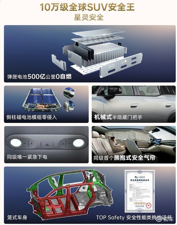 安全防护堪称“移动堡垒”,乘员舱和电池仓采用1500MPa热成型钢打造,高强度钢占比72%,顶部抗压7.5吨。弹匣电池2.0实现枪击不起火,累计装车超130万台0自燃,720°电池防护全面应对碰撞风险。标配6个安全气囊,侧气帘长度达2.2米,创新后排儿童专属头部保护腔体,同级唯一紧急下电功能进一步提升行车安全。