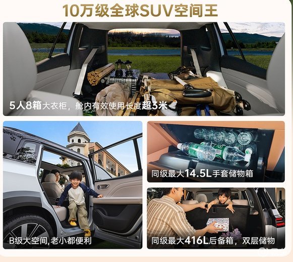 储物能力同样拉满,14.5L同级最大手套箱可容纳12瓶矿泉水,全车多处挂钩设计满足随手放置需求,416L后备箱满座5人仍能放下8个20寸行李箱,电动尾门低门槛设计让装载更轻松。