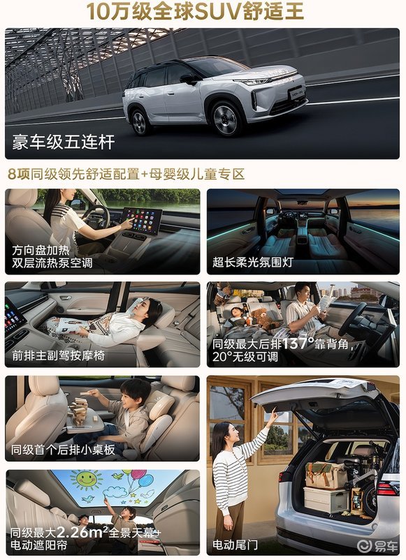 舒适配置更是诚意十足,八项同级领先配置涵盖方向盘加热、近4米柔光氛围灯、主副驾8点式按摩座椅、后排20度无级可调座椅等。母婴级环保座舱达到婴儿A级标准,2.26平方米全景天幕紫外线隔绝率超99.9%,双层流热泵空调既保证制热效果又降低电耗,配合后五连杆悬架,带来30万级豪车驾乘质感。