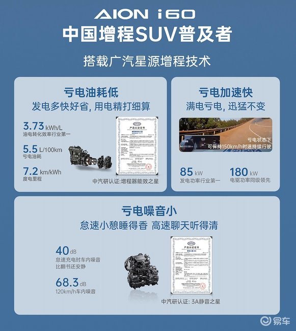埃安i60提供增程、纯电两种动力选择,全面满足不同用户的出行需求。增程版搭载广汽星源增程系统,1.5L专用发动机采用自研“火山型燃烧系统”,油电转化效率达3.73kWh/L,实现5.5L/100km的同级领先亏电油耗。85kW行业第一发电功率搭配180kW高功率电机,确保亏电状态下仍能保持150km/h高速持续行驶,彻底终结“亏电高油耗、加速慢”痛点。