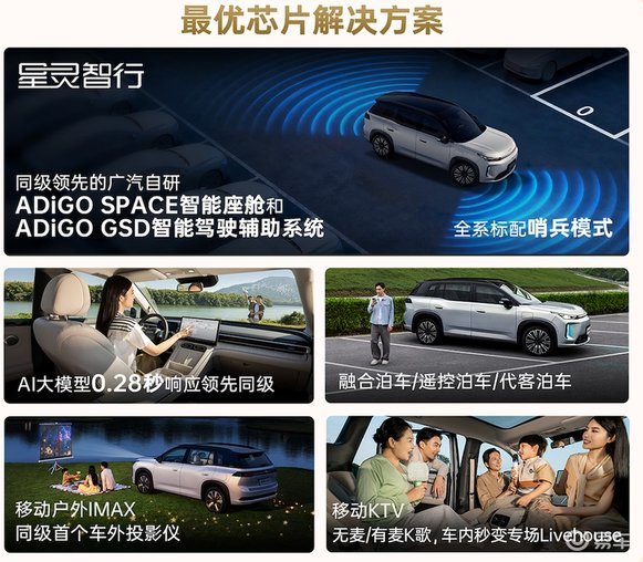 辅助驾驶层面,广汽GSD智驾辅助系统覆盖41类主场景、392类子场景,高速NDA 1000公里接管次数少于1次,支持300多种泊车场景,最快22.3秒完成泊车,同级首搭2km超长代客泊车功能。全系标配哨兵模式和行车记录仪,手机可随时查看监控视频。