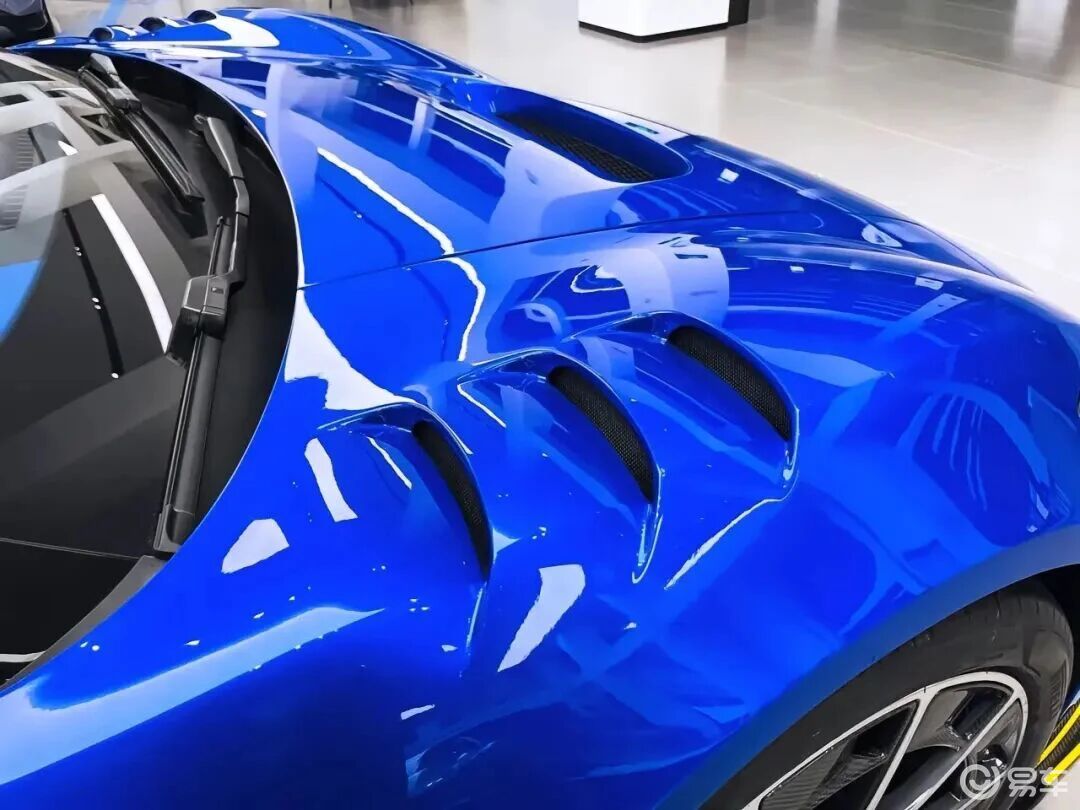 先看这颜值,简直是 “集百家之长” 还不违和!前脸像路特斯 EMIRA,圆润车鼻配三段式熏黑导风槽,碳纤维前唇加黄色饰条,性能感直接拉满;“破晓之刃” 大灯上扬的劲儿,跟兰博基尼似的,机盖还有中置风洞和鱼鳃导流孔,战斗气息快溢出来了!侧面更绝,活脱脱小一号仰望 U9,流畅肩线 + 无边框悬浮车顶,蓄势待发的样子太帅了;21 英寸锻造轮毂配黄色卡钳,还是奔驰 AMG ONE 同款散热设计,再加上欧泊蓝配色和无框车门,高级感和运动感全有了!尾部天鹅颈大尾翼、碳纤维扩散器,双菱形尾灯像宾利又像丰田 SUPRA,懂车的一看就知道不简单!
