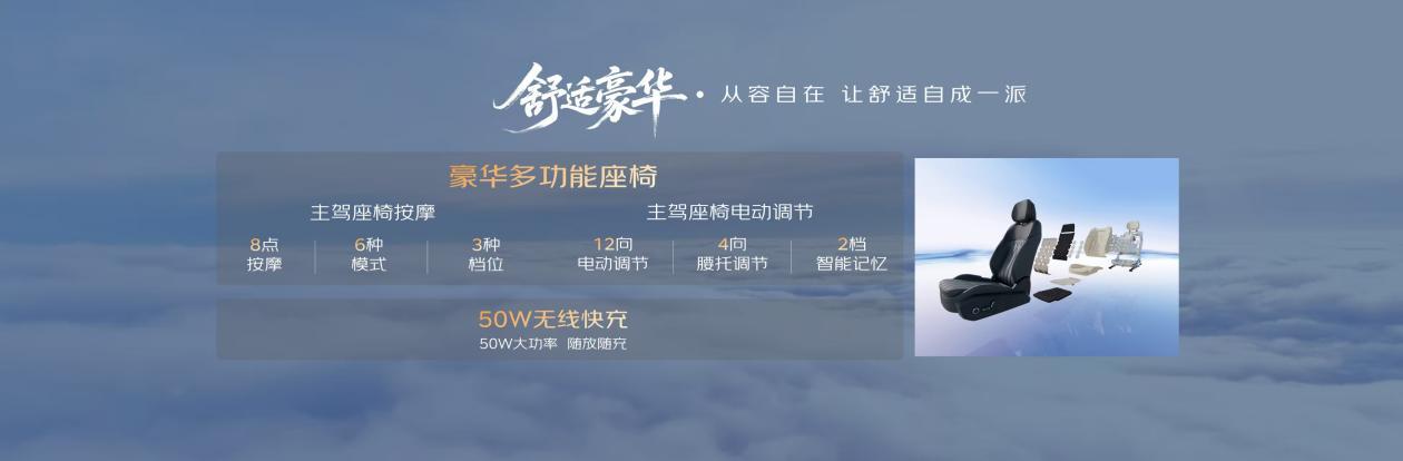 舒适上,新车致力于打造全车成员的移动舒享空间。全新长风青云版主驾配备12向电动调节、8点按摩及通风加热功能,缓解长途驾驶疲惫;PC光学材质墨镜遮阳板,有效防紫外线且不遮挡视线;领先的NVH静谧工程搭配双层夹胶隔音玻璃,隔绝外界喧嚣,营造豪华静谧座舱;562L超大后备箱与G-Clean空气净化系统,为家庭出行提供便捷与清新,每一处配置都贴合用户需求。