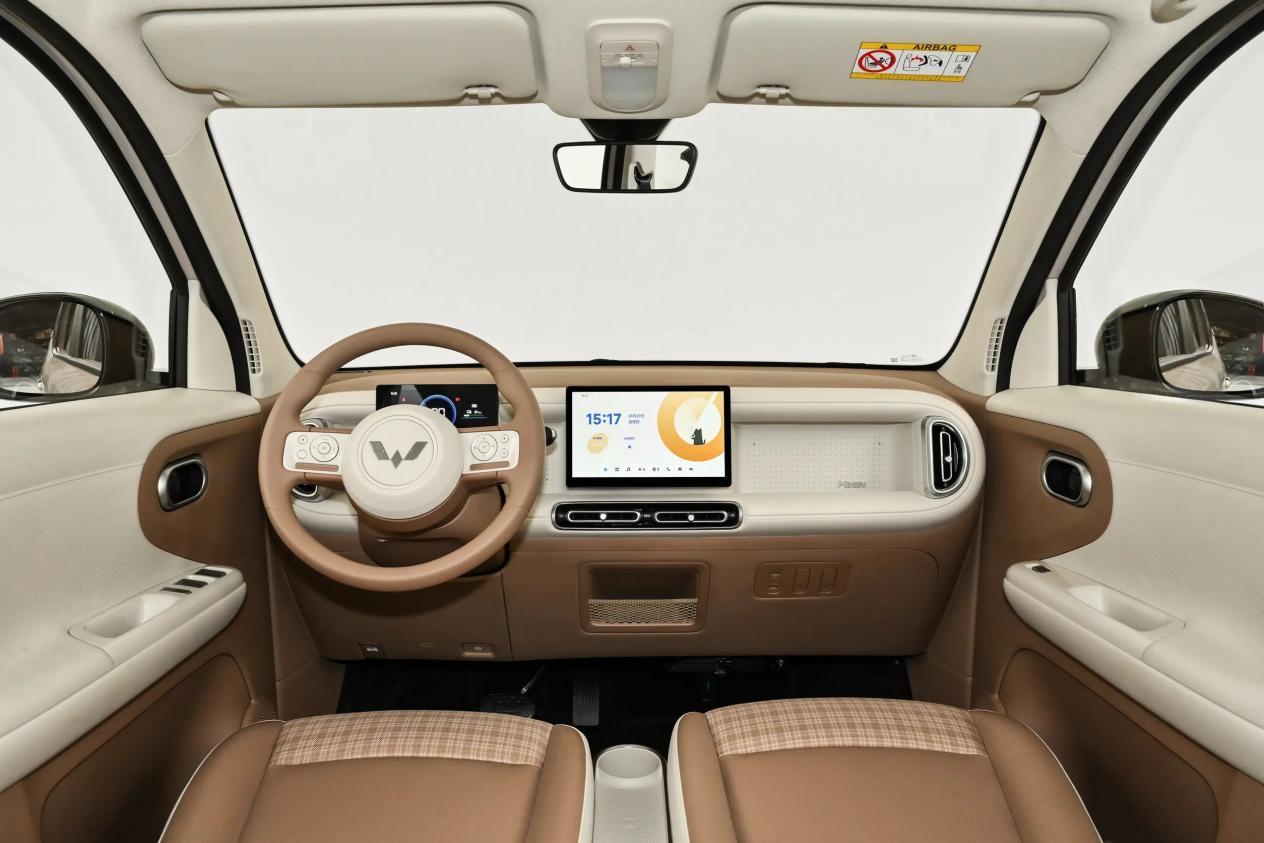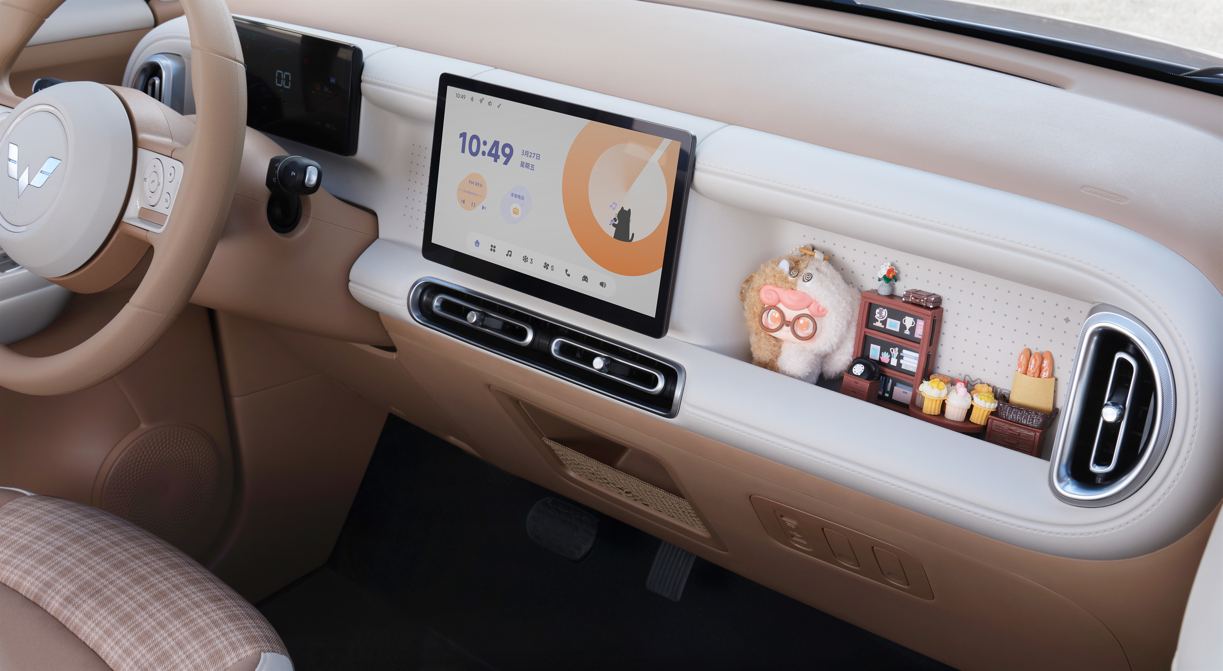 紧接着为了满足当下年轻消费者对于个性表达的需求,第五代宏光MINIEV在颜值和细节上也融入了更多玩趣属性,外观采用了“甜趣方糖”设计语言,经典方盒子造型搭配圆乎乎的大灯,贯穿式镀铬饰条首尾呼应,再加上四叶草轮毂,还有绿悠悠、白绒绒、灰萌萌三款带幻彩珠光的复古车色,精致又可爱,完全没有廉价小车的粗糙感;然后内饰也使用了“焦糖奶油”撞色做了个环趣美学座舱,温馨又复古,副驾还有专属的“百变造景空间”,可以用来放潮玩摆件、化妆品,具有很不错的可玩性。