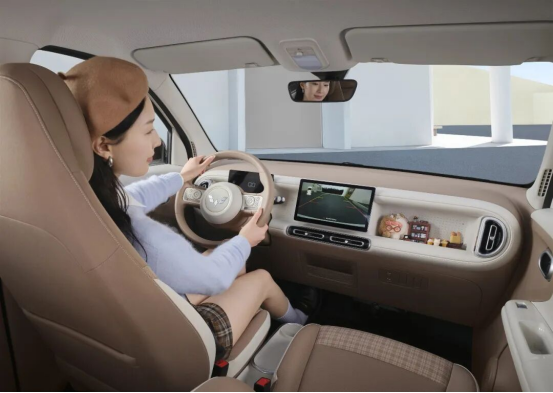 再看设计和智能化配置,宏光MINIEV第五代新车明显更懂年轻人的心态。 外观从前款的偏方正的款式,进化到“甜趣方糖”设计语言,圆润中带方廓,前脸的“笑颜”和“向日葵酒窝”辨识度很高。车色上给了绿悠悠、白绒绒、灰萌萌这三款珠光复古色,八层涂装工艺带来的光泽感比前款的普通漆面更出挑。内饰换上“环趣美学”和“焦糖奶油”配色,最特别的是副驾前方那个“百变造景空间”,可以用来放盲盒、手办,把仪表台变成自己的个性展台。怀挡替代了前款的旋钮或传统挡把,换挡不低头更安全,也腾出了中控空间。10.1英寸中控屏配全新萌趣UI,前款屏幕尺寸和界面风格都不同,而且第五代OTA后支持CarPlay、HiCar、CarLink三种手机互联。加上手机远程控制、无感进入这些功能,智能化水平往前迈了一大步。