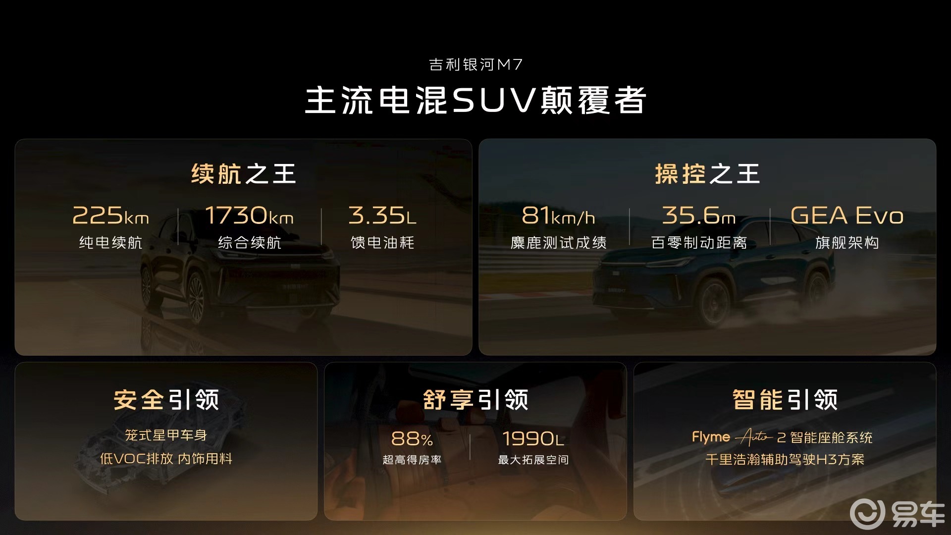 过去两年,插混市场的竞争焦点是“满油满电综合续航”。当大家都能做到一千公里以上时,这项参数的内卷边际效应已递减。吉利银河M7的聪明之处在于,它敏锐地捕捉到了用户心智的深层痛点——日常通勤场景中,纯电续航才是真正的刚需。