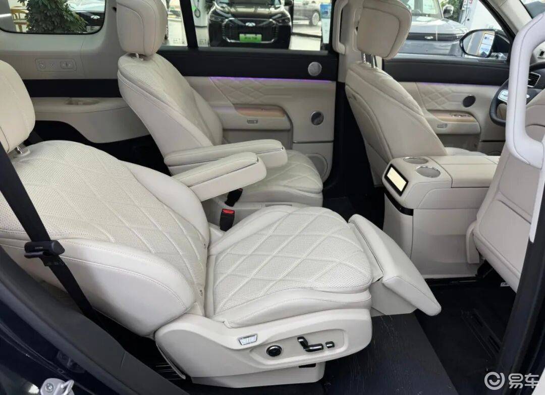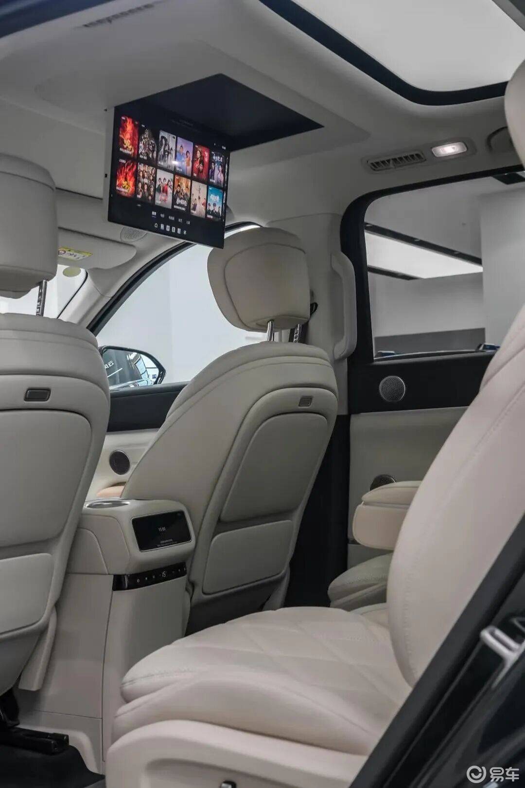 第二排,冰箱彩电大沙发都配齐了,头顶17.3英寸3K彩电是标配的,如果想要更好的视听享受,可以选择23扬声器的伯牙之音,前面还有个小屏幕,是二排功能调节,下方9.2L冷暖冰箱,可以做到13分钟极速制冷和24h离车持续工作,右侧座椅支持一键零重力模式。
