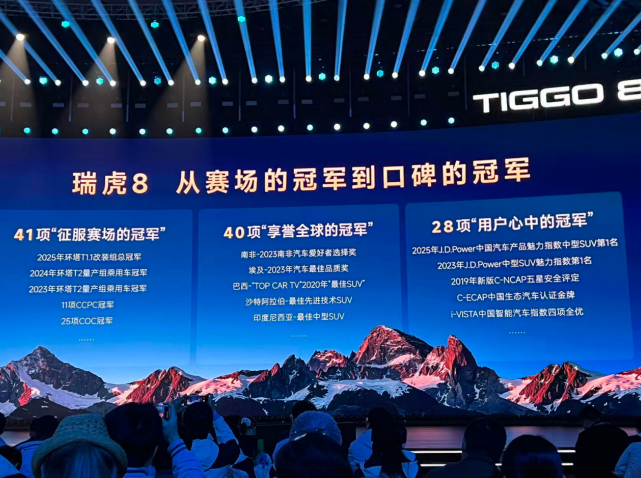 先说说瑞虎 8 家族的底子—— 咱选车不能只看新车,得看它背后的口碑硬不硬!这瑞虎 8 可不是花瓶,赛场上拿了 40多项荣誉,还有J.D. Power 连续两年给它中型 SUV 冠军,这就像给车发了 “用户满意度证书”,说明买过的人都认。再看销量,去年卖 33 万辆、今年七个月连冠,全球 145 万人选它。要是车不好,能有这么多人愿意掏腰包吗?