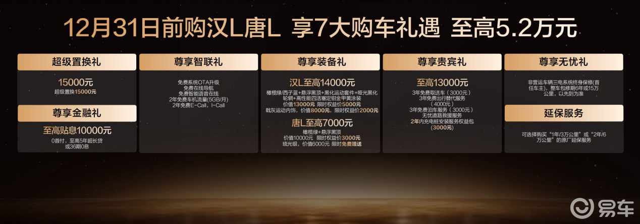 此次,汉L EV 3款车型,超级置换补贴后售价20.48万~26.48万元;汉L DM 3款车型,超级置换补贴后售价19.48万~24.48万元;唐L EV 3款车型,超级置换补贴后售价22.48万~27.48万元;唐L DM 3款车型,超级置换补贴后售价21.48万~27.08万元。同时,比亚迪还为用户准备了包含置换补贴在内的至高价值5.2万元(汉L)/4.5万元(唐L)尊享礼遇。(以上权益截至12月31日)