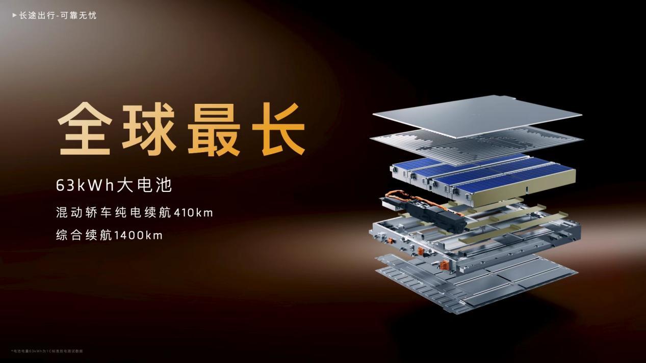 追光L搭载1.5T插电混动系统,发动机最大功率110kW,前后电机最大功率分别为150kW和230kW,系统综合功率达485kW,百公里加速4.8秒。新车基于800V高压平台打造,配备63kWh三元锂电池组,CLTC纯电续航达410km,创下全球混动轿车最长纯电续航纪录,综合续航高达1400km。