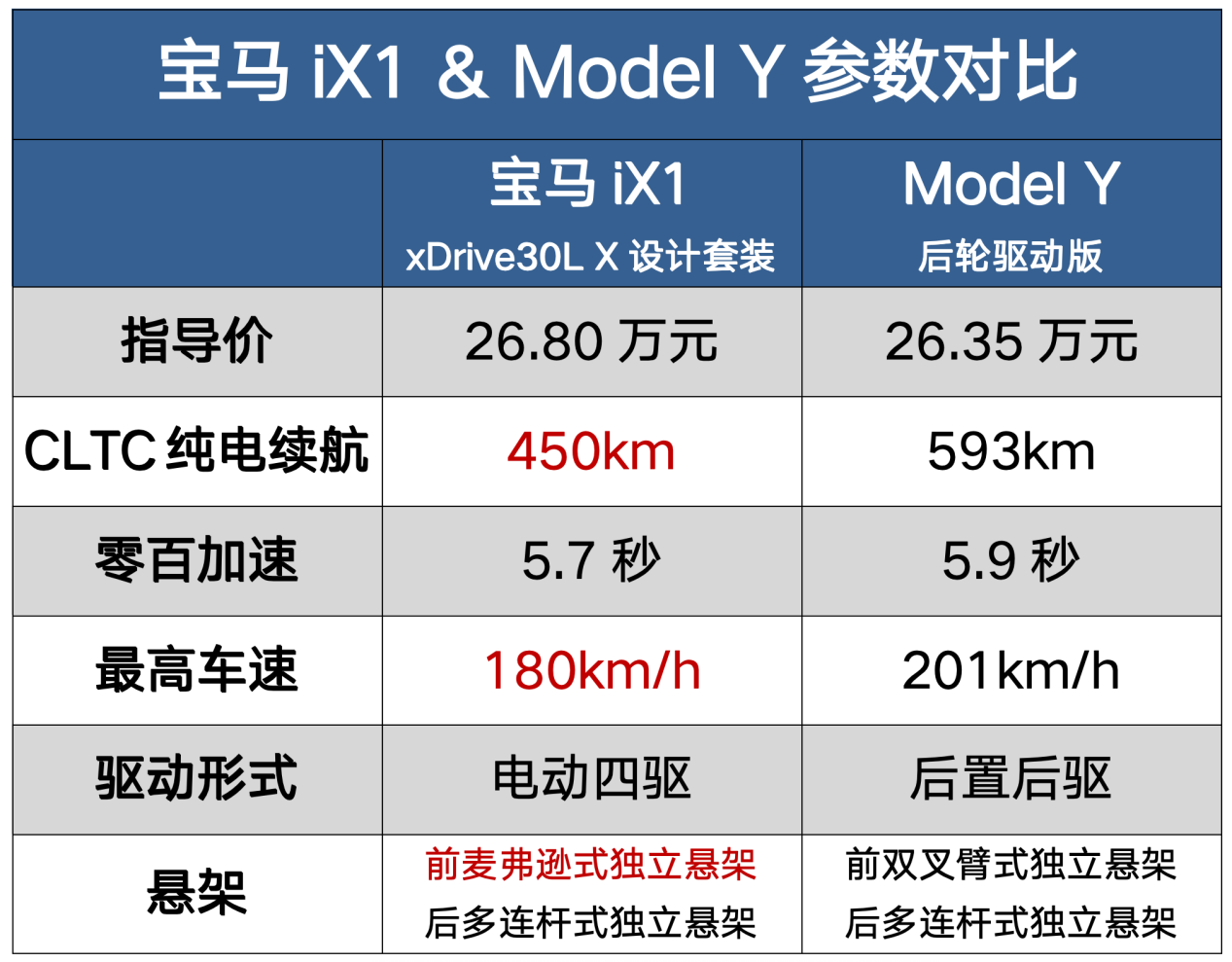 我把宝马iX1和同价位的特斯拉Model Y做了一个简单的参数对比,两者的价格非常接近,但是宝马iX1只有450km的纯电续航,且最高车速只有180km/h,前悬架也是麦弗逊式的,这些都是不如特斯拉Model Y的,当然了,宝马iX1的优势是有一套四驱系统。单纯从上面两款车的硬件参数上来看,我觉得宝马iX1是不如特斯拉Model Y的。